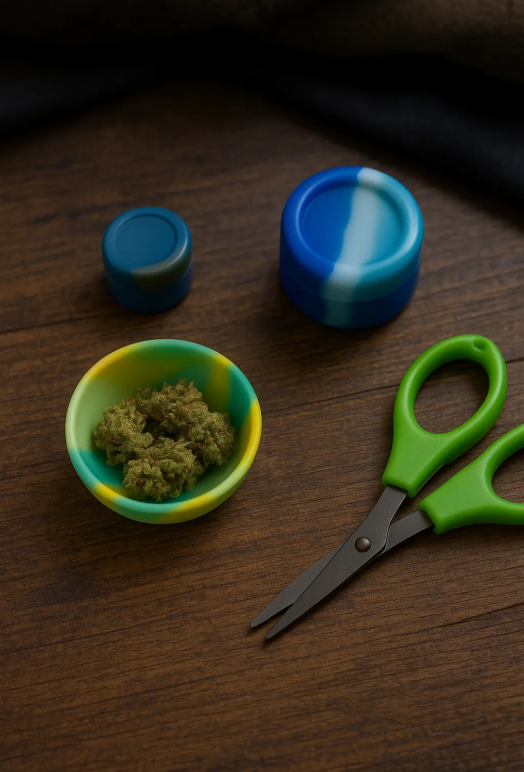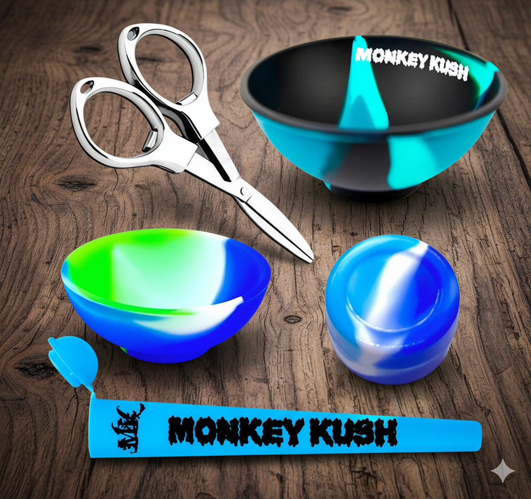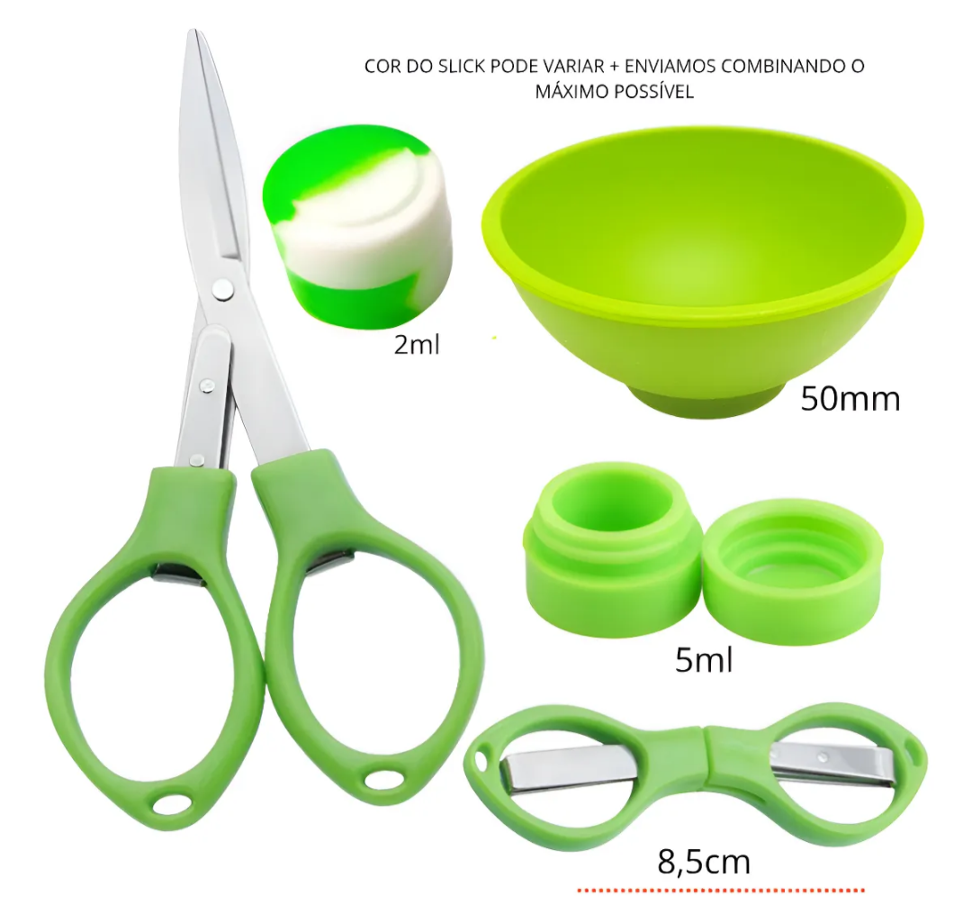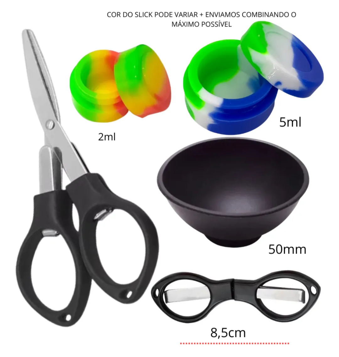 – Kit Tabacaria 5 Peças – Cuia 50mm, Cuia 67mm, Tesoura, Slick de 5ml e Tubete.